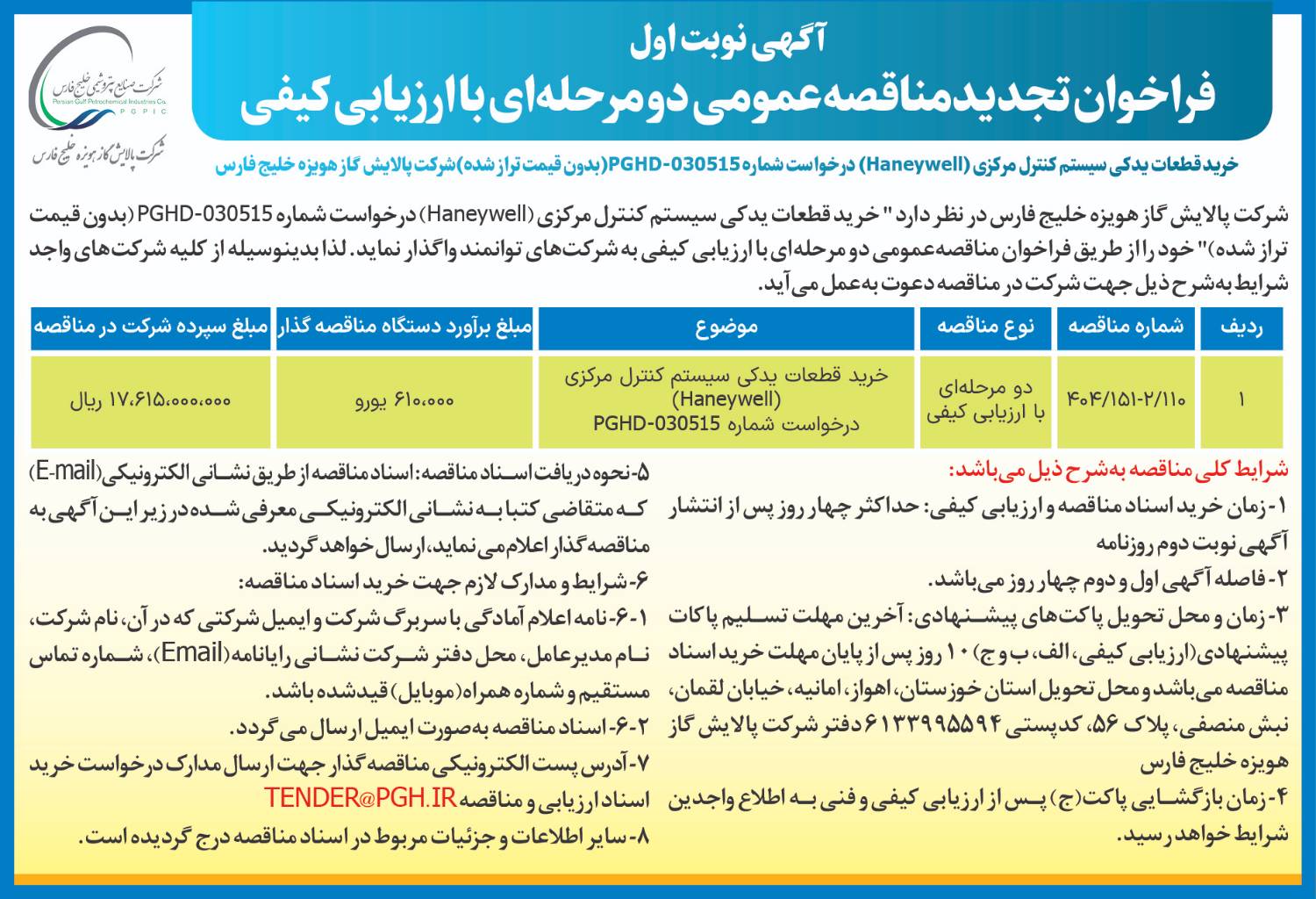 آگهي نوبت اول فراخوان تجدید مناقصه عمومی دو مرحله ای با ارزیابی کیفی خرید قطعات یدکی سیستم کنترل مرکزی(Haneywell)درخواست شماره PGHD-030515، (بدون قیمت تراز شده)شرکت پالایش گاز هویزه خلیج فارس