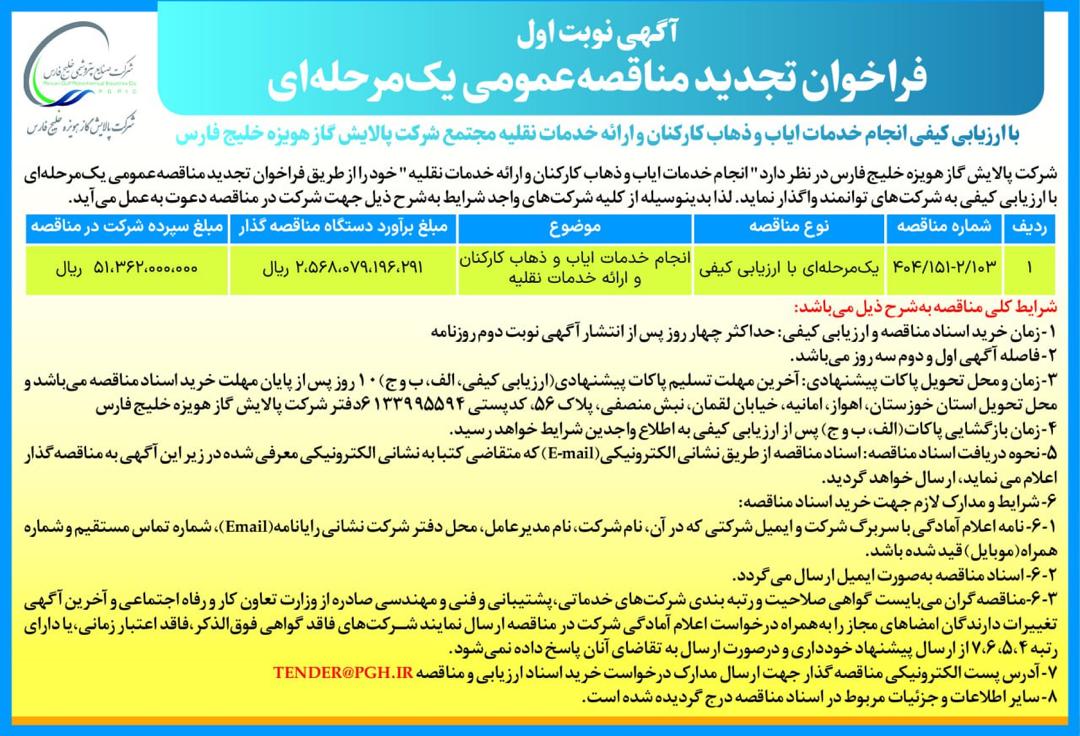 فراخوان تجدید مناقصه عمومی یک مرحله ای با ارزیابی کیفی انجام خدمات اياب و ذهاب کارکنان و ارائه خدمات نقلیه مجتمع شرکت پالایش گاز هویزه خلیج فارس