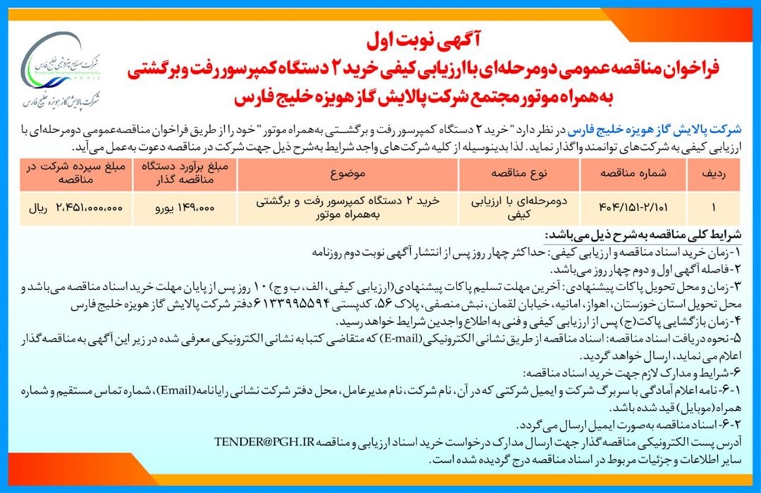 فراخوان مناقصه عمومی دو مرحله ای با ارزیابی کیفی خرید 2 دستگاه کمپرسور رفت و برگشتی به همراه موتور مجتمع شرکت پالایش گاز هویزه خلیج فارس