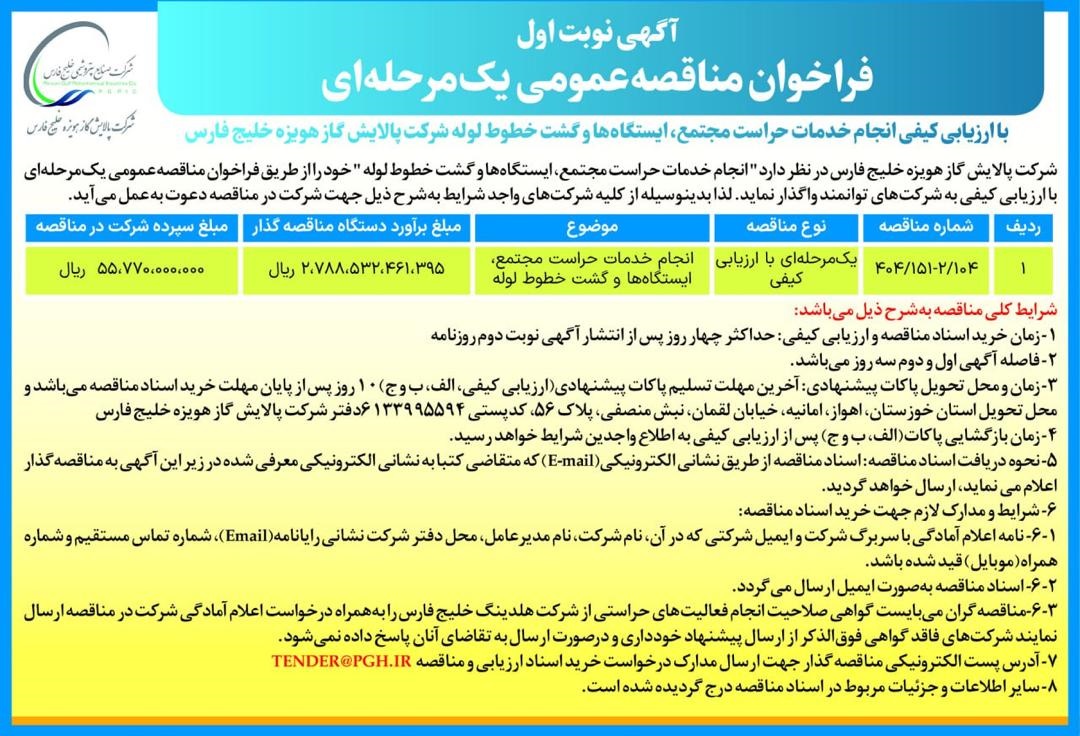 فراخوان مناقصه عمومی یک مرحله ای با ارزیابی کیفی انجام خدمات حراست مجتمع، ایستگاه ها و گشت خطوط لوله شرکت پالایش گاز هویزه خلیج فارس