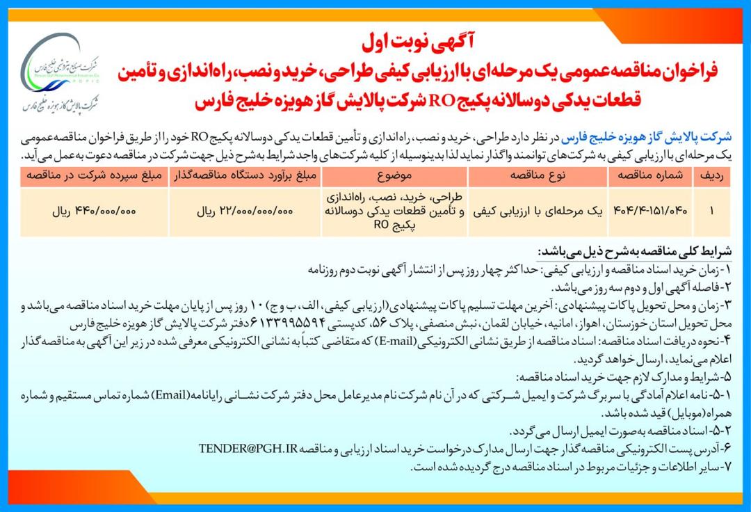 فراخوان مناقصه عمومی یک مرحله ای با ارزیابی کیفی طراحی، خرید و نصب، راه اندازی و تامین قطعات یدکی دوسالانه پکیج RO شرکت پالایش گاز هویزه خلیج فارس
